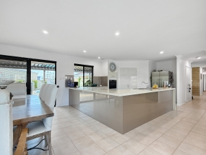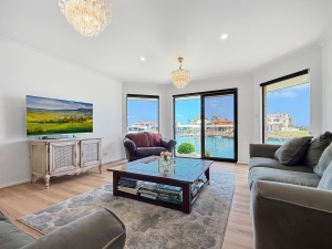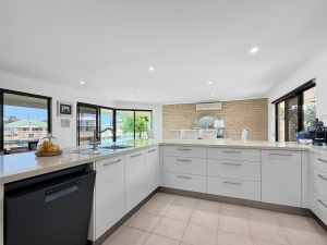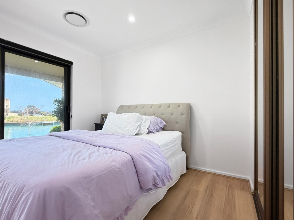 Inside, you’ll find open-plan living areas designed to capture uninterrupted water views from every angle. The kitchen features waterfall stone benchtops, a walk-in pantry, double fridge recess, and quality appliances.